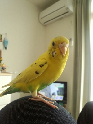 カラダが黄色で頭に黒いバーコードのような線がいくつか入ってます。羽根には黒い点々があります。人の肩に乗るのが好きです。「ちゅんちゃん」「どしたの」としゃべります。0歳ですが、よく飛びます。