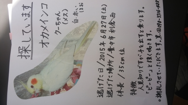 オカメインコ 迷子 豊中市、尼崎市