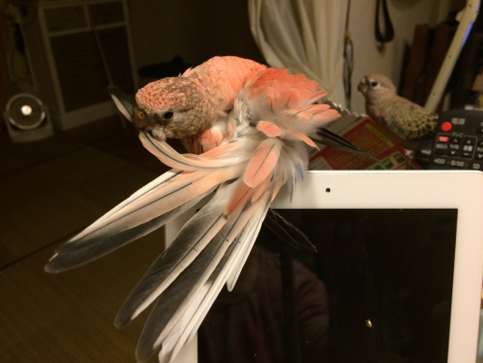 羽が揃ってPipiが猛スピードで飛び回るようになると、他の仔達も触発されて盛んに飛び回るので、部屋中が大変な騒ぎになりますけどね。(笑)