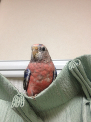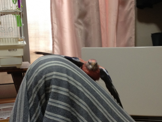 オスのPepeは羽根をクリップされた生活がやや長かったせいか放鳥しても基本的に床の上を歩く仔です。手や肩、テーブルの上に乗せてもしばらくすると降りていきます。飛べるのに自分のケージの上以外に高いところにはまるで止まろうとしません。
