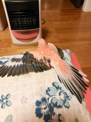 尾羽根がなくても左右の羽根だけで多少は飛べるので日常生活には支障がなさそうですが、今ひとつ元気がなくシュンとしています。