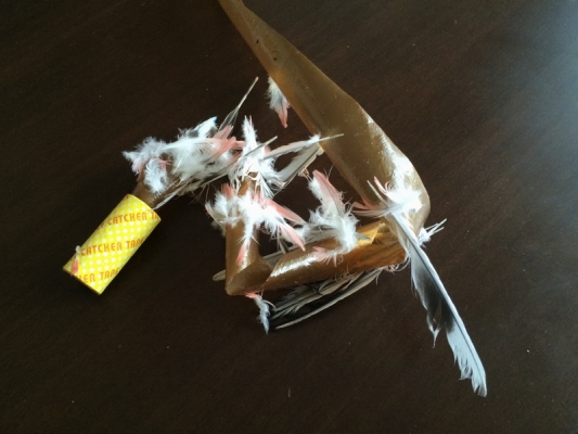左右の風切り羽にも粘着剤がまとわりついてしまいました。拭き取れるだけは拭き取り、ベビーパウダーをまぶして応急処置。