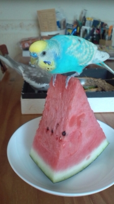 セキセイインコは水色の体で、顔の一部が黄色です。名前はナッツ。5歳オスです。ゴニョゴニョとは話しますが、はっきりとはしゃべりません。息子の口真似となっちゃーんと呼ぶと「ピヨ!」と返事をします。人馴れはしていないので、家族以外には寄っていかず、呼んでも返事をしないかもしれません。他人が来ると、ケージから出てきません。体重は35グラムぐらいです。
