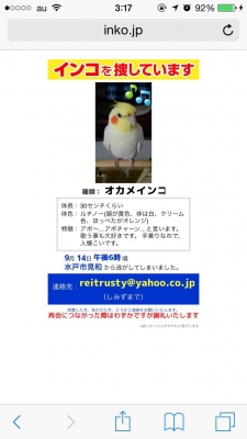 茨城県水戸市 オカメインコが迷子になりました