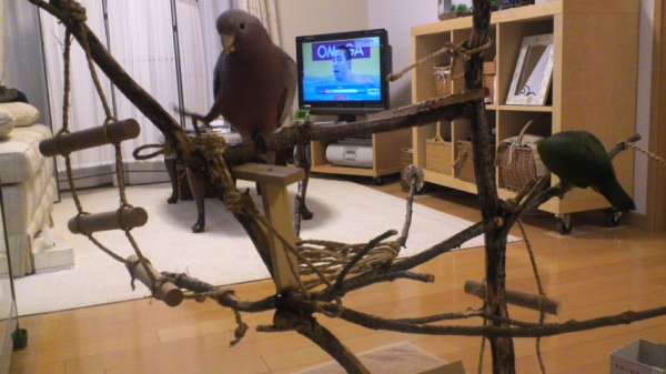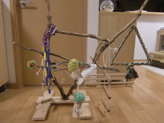 小さなインコちゃん達なら、市販の止まり木や割りばしとかを綿ロープとかでくくって組み合わせたりして作ることが出来そうですね。