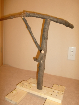 まず、土台用に板を3枚組み合わせてネジで止めます。次に土台の板の真ん中に支柱にする大き目の枝をのネジ止めします。裏からドリルで穴を開けて、ネジで止めるだけです。ネジ1本だけだとぐらつくので、ネジを2本使って止めるとしっかりします。あとは止まり木用の木を横向きに(好みの型で)ネジ止めするだけ。