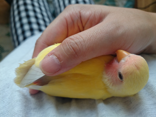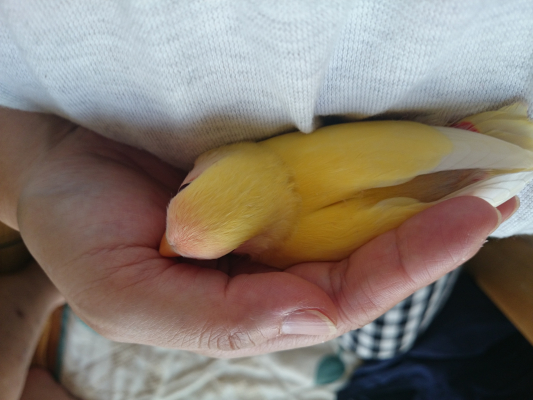 先程、初めての挿し餌をしたのですがずっと甘えて鳴いていて…胸元に乗せて脱いだ服を掛けて包んだらようやく大人しくなりました。