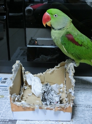 今では放鳥時の定位置で段ボールを破壊してます。