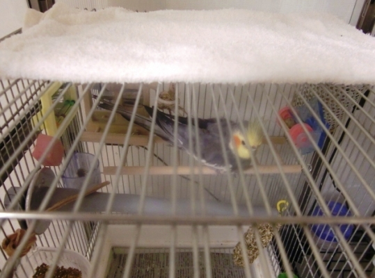 また、ケージの上には濡れタオルをかるく絞ってたたんで置いています。オカメが羽繕いをした際にボワッと広がる羽毛や脂粉が濡れタオルについて舞い上がりを防げるのと、今の時期は乾燥対策にも役立っていると思います。