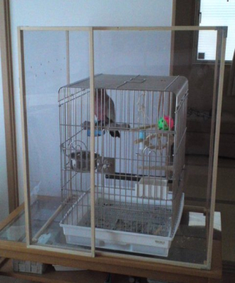 我家のオカメちゃんはケージより倍くらいの空間の大きさの透明のケースで囲っています。防音対策ではなく、あくまでも汚れ防止の為なので2?厚の透明塩ビ板またはアクリル板で十分です。(ちなみに我家はケースを手作りしています。木やアングルで四角枠を組んで、適当に空気穴を開けた透明の塩ビ版やアクリル板を取り付けたものです。)私は経済的事情で手作りですが、もちろん市販されているもので良いと思います。