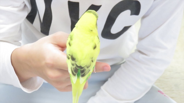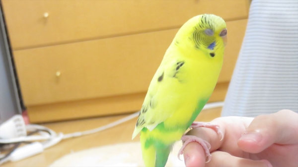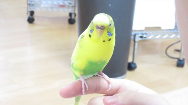 先日、日産プリンス東根店さんに寄ったところ、セキセイインコ ハルクイン(♀)が保護されていました。