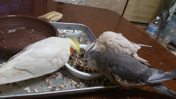 どちらかの小屋で同居をさせたくて、3羽一緒にご飯を食べさしたり、放鳥を同じ時間帯で行ったりしています。ご飯は同じお皿から仲良く食べています。繁殖が目的ではないです。