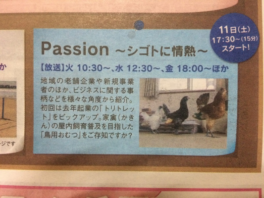 生まれて初めてのテレビのインタビューが自分でも途中から何言ってんのか分かんなくなったり、鶏達の動きがイマイチな撮影になってしまったのに!思い返せば結構不安です。が!JCVの担当者さんはまさに情熱ある感じの方だったので、きっと上手く作ってくれると信じてます☆他力本願(=´∀`)人(´∀`=)