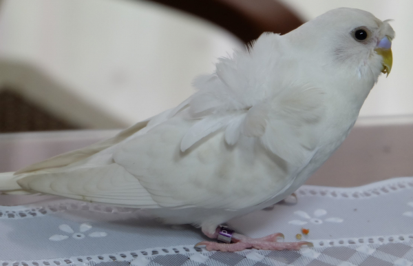 背中に羽衣の特徴である天使の羽根のようなフワフワした羽根が生えています。足環付いてます。
