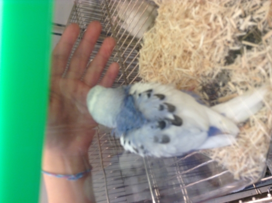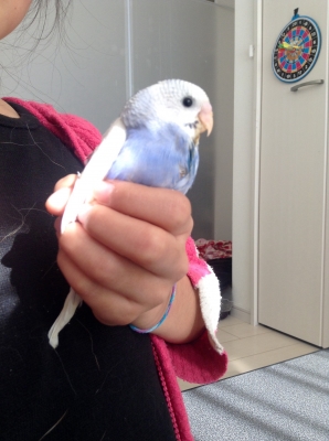 特徴は、白色ベースで胸と背中が青紫色です。背中の羽根の先に黒色が入っています。11月生まれでやっと手乗りになったところでした。