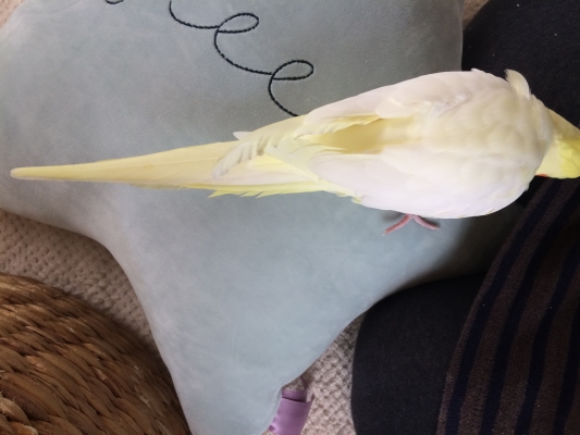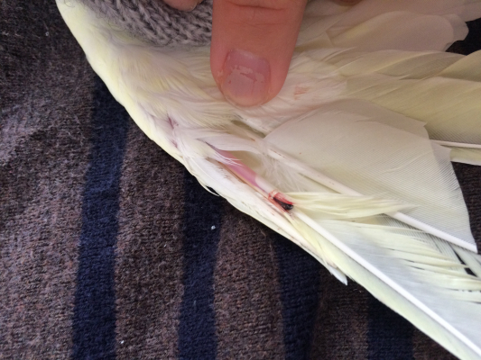 ルチノー♀推定 昨年の7〜8月生まれ(販売店によると)のニコちゃんです。生えかわりで随分体の毛並みは綺麗に落ち着いてきましたが、まだクリッピングされた羽が残っており、ゆるやかに換羽中のようです。めったにないのですが最近オカメパニックを起こしたことがあり、飼っている2羽ともわずかな出血がありました。それが関係しているのか、それとも もしかしたらPBFD?なのか、妙な羽をみつけました。今の所、鞘の中心に黒っぽい血豆のようなものが…触ってみると柔らかく、少し血が滲んだのでそれ以上は触らずにいます。症状があるのはこれ一枚だけです。オカメのPBFDは感受性が低いと聞いたのですが、これはやはりPBFDでしょうか。