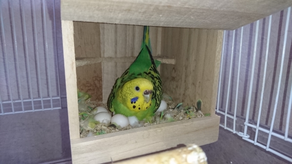 セキセイインコのプーちゃん巣箱を覗いたらいつの間にか卵を沢山産んでいた!!!疑卵の意味ナッシングだよ!!!暖めている姿も超かわいい🎀