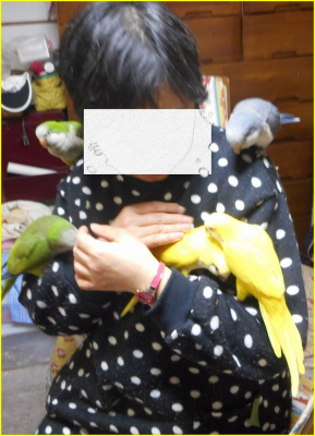 写真はワザワザインコを体に乗せたのでは無く、勝手に嫁の体に上がっていったものです。(もう1羽頭の後ろに隠れています)