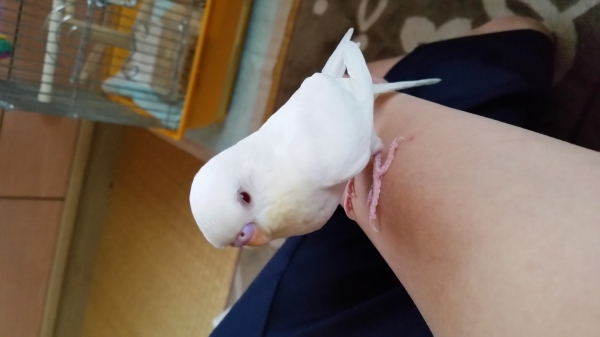 まだ2ヵ月位のコで目は赤、身体は白、クチバシの下は少し黄色っぽいです!羽根は切っていたのですが、何故か高く遠くに飛んで行ってしまいました。