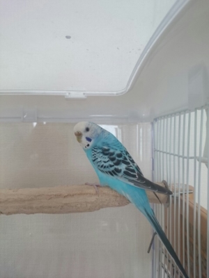 羽色は明るい水色で、頭は白です。左の鼻頭が茶色くなっています。(最近、右鼻の茶色がはがれたので不明中に左の茶色もはがれているかもしれません)