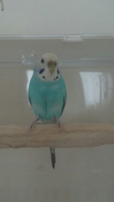 羽色は明るい水色で、頭は白です。左の鼻頭が茶色くなっています。(最近、右鼻の茶色がはがれたので不明中に左の茶色もはがれているかもしれません)