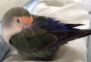 色は深緑色(モーブ)で鼻の上にオレンジ色があります。とても可愛らしく懐きます。