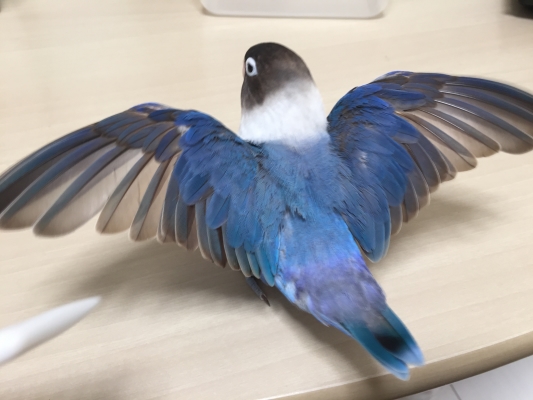 ペケの運動は普段、放鳥中に数回飛ぶだけですが、この休日に私と主人とで数メートル離れてペケを交互に呼び合い何回も往復させてみました
