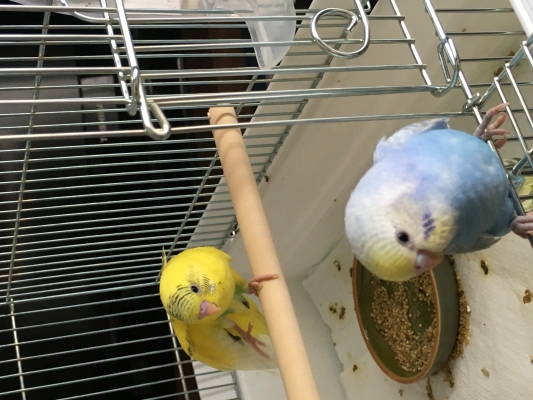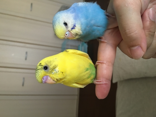 ・8/11(木)に、ペットショップで、生後ちょうど1ヶ月の、念願のセキセイインコの雛2羽をお迎え。留守番がかわいそうなので2羽飼おうと主人と話しており、ショップに行ったとこと、ちょうど同じゲージに仲のよい2羽がいたので、そのままお迎え。性別不明。黄色がひなこちゃんで、青がハッピーちゃんといいます。