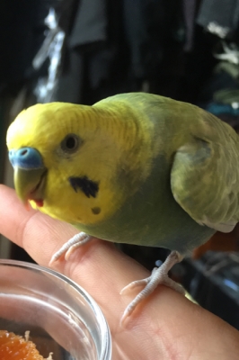 色:顔が黄色でお腹が青いです。羽はグレーがかった黄色です。左羽が少し浮いたようになっています。