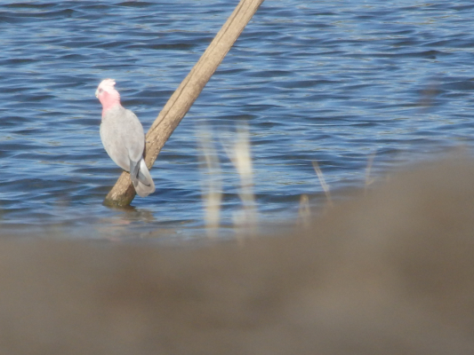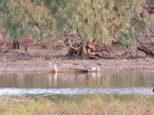 池の対岸には、モモイロインコの群れが集まってきていて、