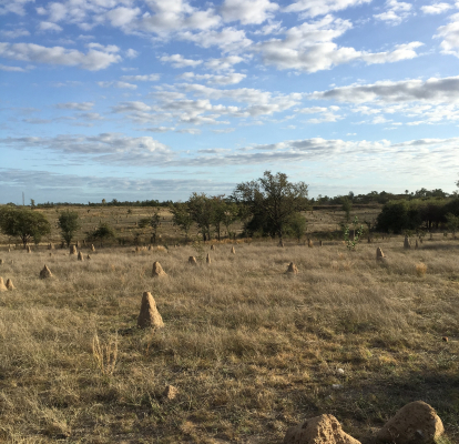 私が見たオーストラリア乾燥地帯の風景は、地平線まで一面に広がるまばらなユーカリの木とその下にところどころ生えた枯れかかった草と、これだけはたくさんある蟻塚。