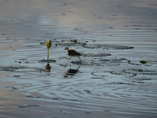 そこで、翌朝は、セキセイインコが水を飲みにやってくる(かもしれない)という水辺で、朝早くから到着を待ちました。