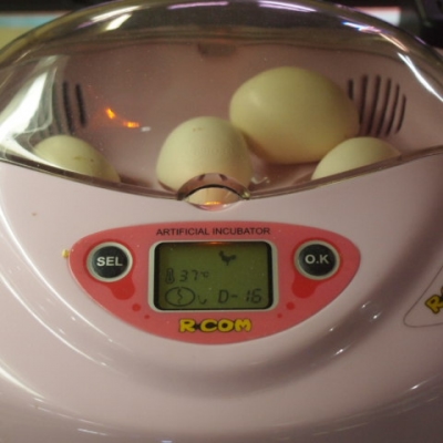 こんにちは!さんまザウルスさん(^^)マメチャボなんていたんですね!私は温冷庫で挑戦しましたが失敗しました、孵卵器二台も羨ましいです、そう何度も使うものじゃないし温冷庫ならこれからも使えるしいいかな〜とケチってしまいました…普通の食用の有精卵だったのですが親鳥の種類はわりと大型の鶏みたいで♂だと子供に飛び掛かってきたりと気性が荒かったらどうしたものかと…結局、検卵するとウコッケイ(一個)だけ雛の陰が見えたのですが…ダメでした〜ウコッケイでもわりと大きいので生まれたら犬小屋か屋根付きのサークルで飼うつもりでしたがチャボより小さいチャボならウサギ用ケージとかでもいけそうですね!私もマメチャボの種卵調べてみようと思いました♪私は失敗しましたがさんまザウルスさんにはぜひひよこの誕生見させて欲しいです!また次の結果報告楽しみに待ってますp(^^)q