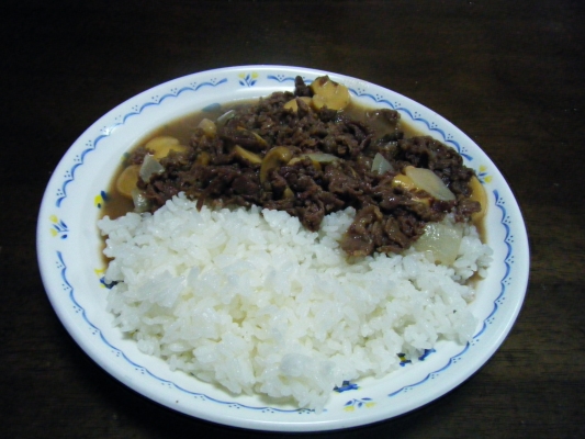 これが、えめるるさん18番の得意料理のビーフストロガロフですね牛肉タップリですね(^^)うちは牛丼です!作りすぎて今日も朝から牛丼でした(笑)