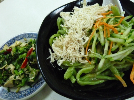細くほどいた鶏肉とキュウリ、それにグリーンの麺をゴマだれであっさりいただくおいしい麺!これで1杯180円くらいです。