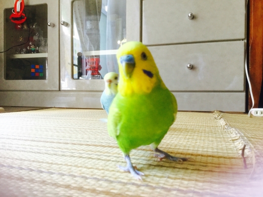特徴:お喋り沢山します。人に馴れています。「おいで」というと指にとまります。手や肩、頭にとまります。捕まえようとすると逃げます。