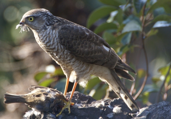 濃尾平野のど真ん中に住んでいます。一番近い山でも直線で20kmほど有ります。子供の頃トンビは見ましたが画像のような猛禽類は初めて見ました。詳しくないので、品種名は解りませんが、庭の立石の上でゆっくり食事中でしたので何とか望遠レンズで撮影できました。品種名がお分かりのお方が居られれば教えて下されば幸いです。