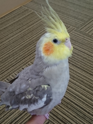 色:頭とトサカが黄色、体はグレーで白い斑点が羽にある