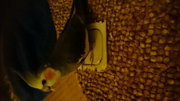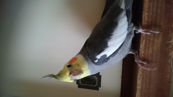 特徴:頭や肩に乗ります。自分の名前や「おいで」「だめよ」「ホー、ホケキョ」等、色々な物真似をします。頭の後ろに白い模様が4つ有り
