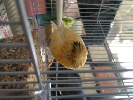 夜は、止まり木の、ヒーター(マルカンの保温電球)に近い位置にとまって寝ています。
