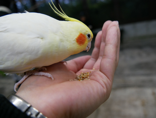 ひなちゃんは、放鳥中は人にまとわりついて離れず、