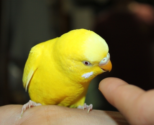 特徴:黄色に赤い目 ルチノー 「ぼくキーちゃん、よろしくね」他、おしゃべりさんです。