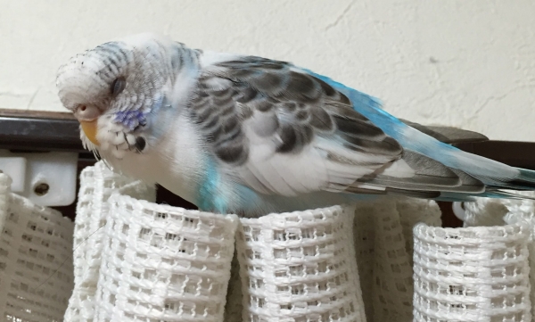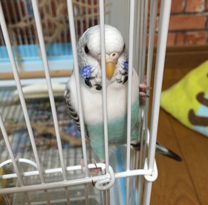 色:頭は白、胸から下は水色と混ざっていて、羽にグレーの模様あり。しっぽは黒