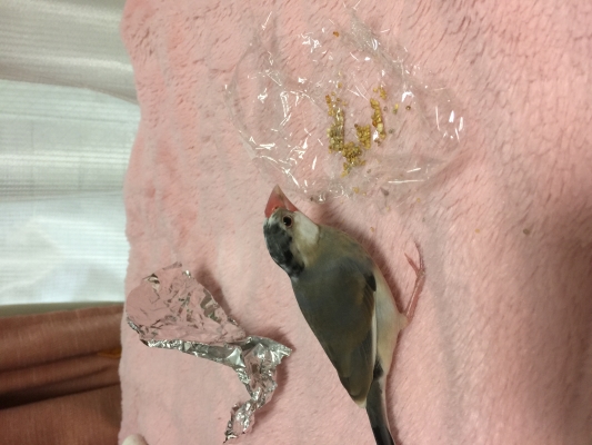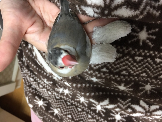 特徴:くちばし、目の周りが赤く、背中の羽がグレーと茶色、胸のあたりが薄い茶色、頭黒に白い斑点模様