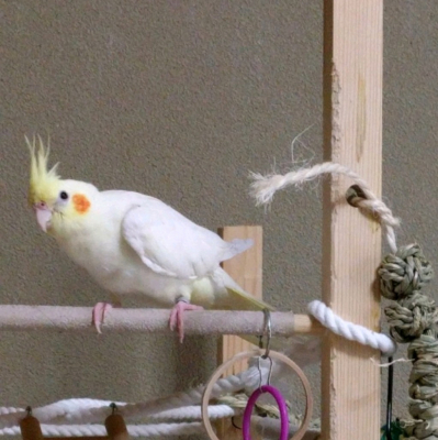 特徴:左脚に足輪をしています。人懐っこく、手や肩に乗りたがります。冠羽の後ろにハゲがあります。