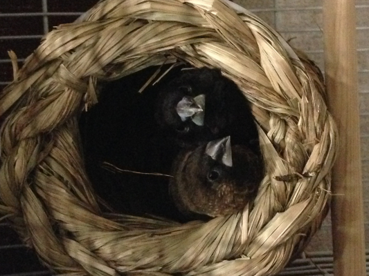 今シーズンは入れてませんが昨シーズンは防寒の為につぼ巣を入れていました。ノアとモカがとても仲良くてつぼ巣の入り口からニョキっと顔を出してるのがかわいくてかわいくて(笑)