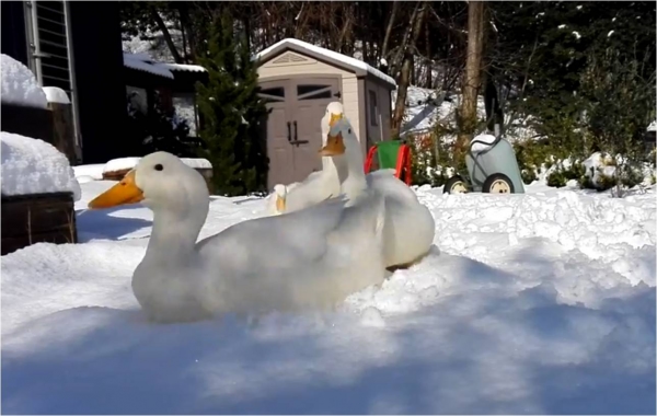 雪の中を喜んで散歩するアヒルたちです。まるで水の中を泳いでいるかのようでしょ☆