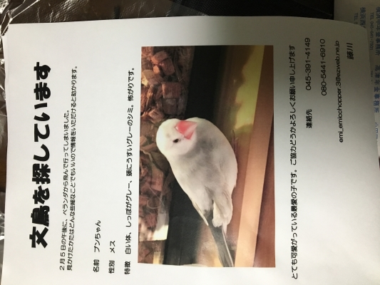 日時:2017/2/5 場所:神奈川県横浜市旭区 鳥の種類:文鳥 名前:ブンブン 色:白とグレーの白文鳥 特徴:頭に点々とグレーのシミ 届先:旭警察署 投稿区分(本人or代理):本人 その他情報: