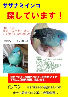 【迷子】静岡県伊豆の国市でサザナミインコが迷子になりました