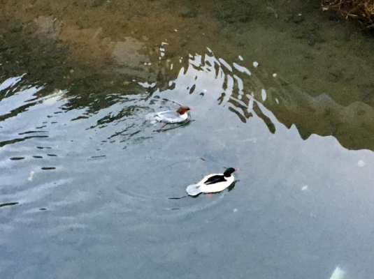 今朝の通勤時に、目の前で川に降りてくる鴨が2羽。